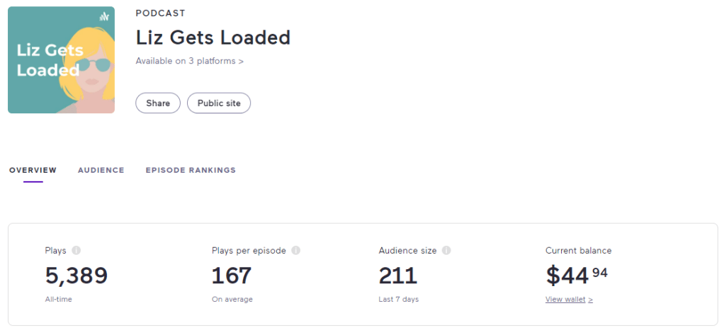 A couple people do, yeah! I just crossed over the 5,000 plays mark. I’ve published about 25 episodes, which means I’m averaging about 200 plays per episode. Here’s a screenshot of my dashboard when I log into Anchor.